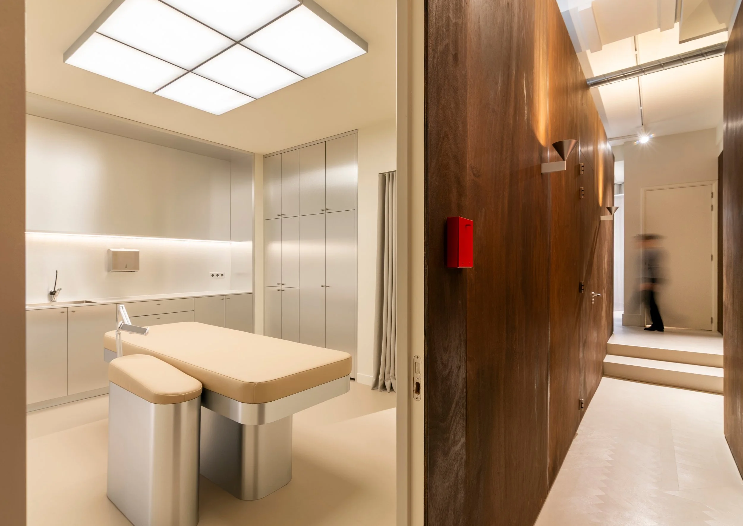 At its core, a wooden volume defines and contains the treatment space. Here, the atmosphere shifts entirely, becoming clean, controlled, and almost futuristic.