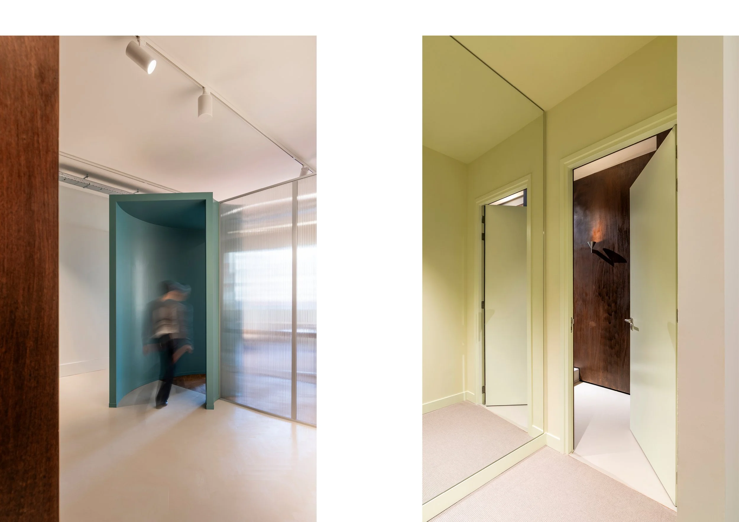 The design is structured around a clear spatial journey. Visitors are welcomed into a warm, inviting environment before moving through a tunnel that gradually leads them into the treatment area. This passage cuts through a semi-transparent wall, marking a deliberate moment of transition.