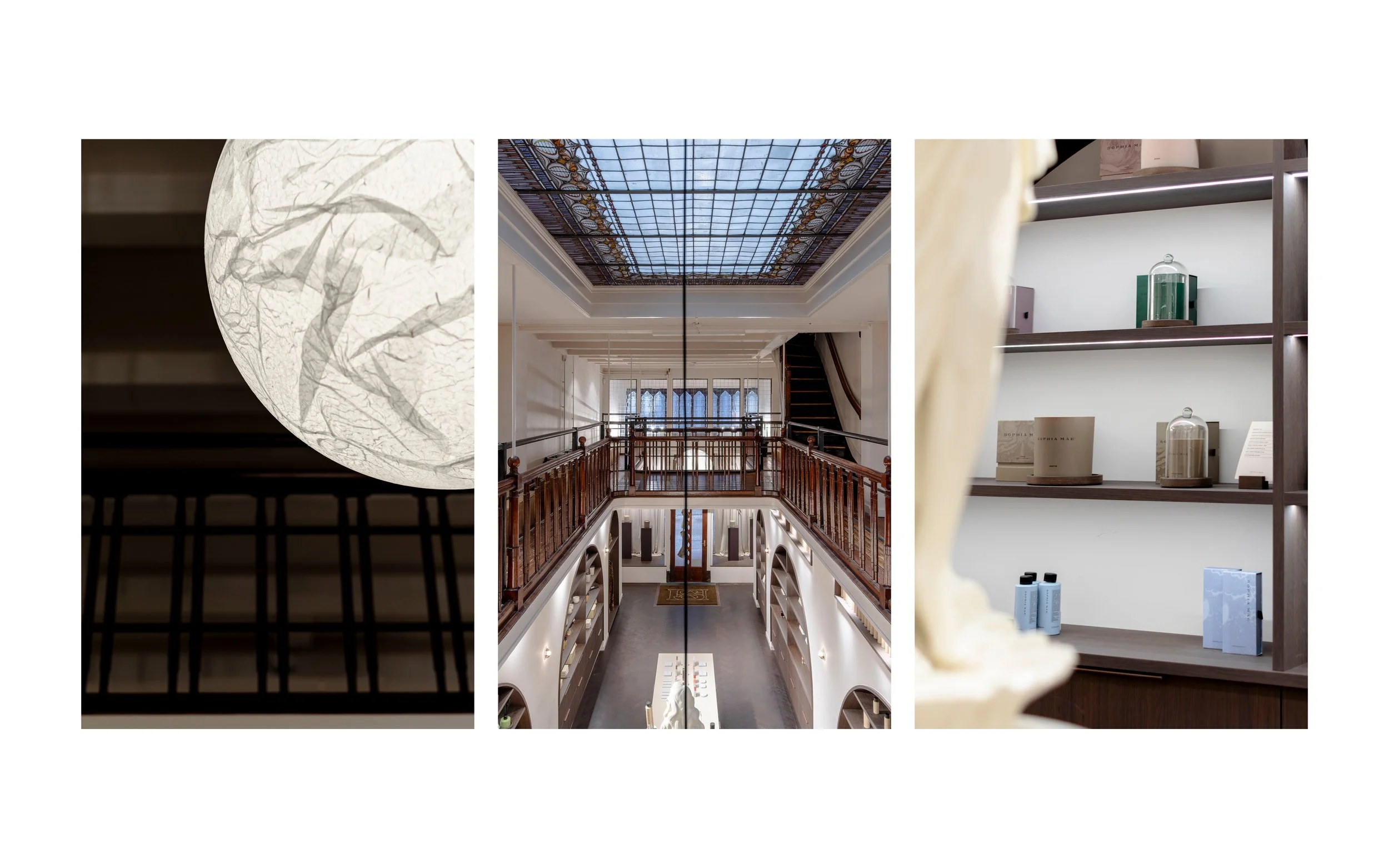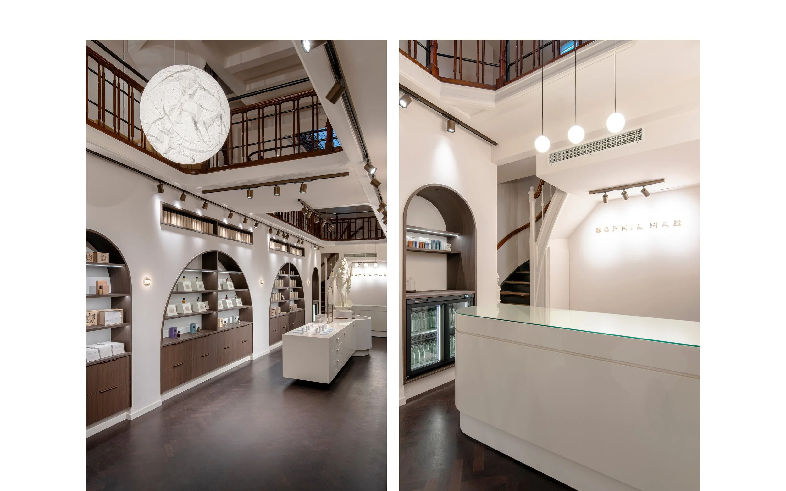 The Sophia Mae flagship store is a refined spatial design project located on Heiligeweg, in the historic center of Amsterdam. Set within a monumental building from 1915, the interior design engages in a subtle dialogue with the architecture, informed by the building’s Art Deco and Amsterdamse School influences.