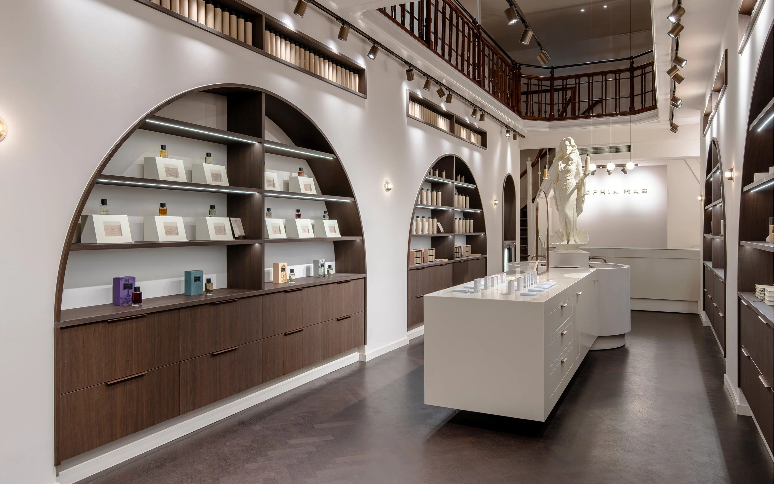 Rather than replicating existing elements, the design translates the architectural language into a contemporary retail environment through materiality, color and proportion. Custom-designed furniture is defined by clean lines and a modern aesthetic, softened by rounded forms and tactile materials that reference the building’s heritage. This careful balance allows the historical context to remain present without dominating the space. The result is a luxury interior that feels calm, timeless and spatially cohesive, a modern retail concept that respects its monumental setting while confidently expressing a contemporary design identity.